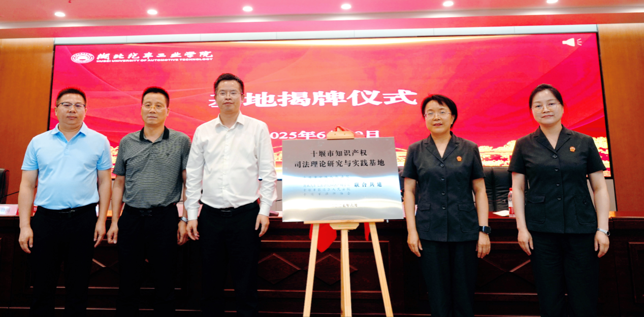 本网讯(文/图 范萌)6月19日下午,由十堰市中院、十堰仲裁委、张湾区法院、市律师协会及我校知识产权学院共建的“十堰市知识产权司法理论研究与实践基地”在产教大楼揭牌。十堰市中院专职委员刘青华、知识产权庭庭长杜语,十堰仲裁委员会秘书处副秘书长刘汉平,张湾区人民法院副院长骆红梅,十堰市律师协会知识产权专委会主任胡碧川及法学院、知识产权学院院长黄永昌等出席揭牌仪式。